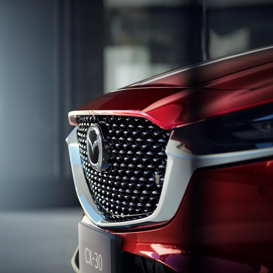 Nổi bật nhất ở phần đầu xe là bộ lưới tản nhiệt dạng tổ ong sơn đen kết hợp cùng viền mạ crom đồ hoạ cánh chim sắc sảo, tinh tế. Dù rằng thiết kế này không quá mới mẻ khi đã xuất hiện trên All-New Mazda3 nhưng phải thừa nhận rằng nó giúp CX-30 trông cuốn hút, thời trang hơn hẳn các mẫu SUV đô thị khác.