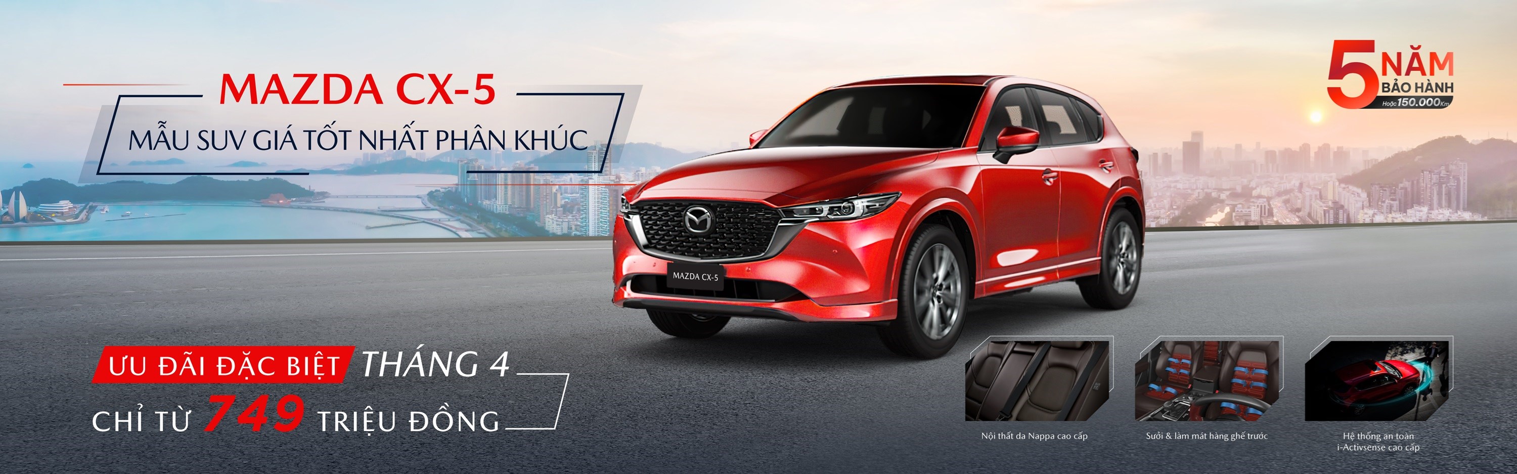 Mazda CX-5 đang được khách hàng ưu tiên lựa chọn và liên tục dẫn đầu phân khúc với doanh số bán ra hơn 1.000 xe mỗi tháng. Ở thế hệ mới, Mazda CX-5 sở hữu thiết kế Artful Design (thiết kế mỹ thuật), mang đến một diện mạo mới cuốn hút và có khả năng lay động cảm xúc. Không gian nội thất được thiết kế hướng đến người sử dụng với các chi tiết được trau chuốt tỉ mỉ, cùng tùy chọn da Nappa cao cấp mang đến cảm giác thư thái và sang trọng. Mẫu xe này còn được ứng dụng công nghệ SkyActiv với sự tối ưu đồng bộ từ động cơ, hộp số, khung gầm và thân xe; giúp tối ưu hiệu năng và tiết kiệm nhiên liệu, mang đến cảm giác lái đầy hứng khởi trên tất cả hành trình.